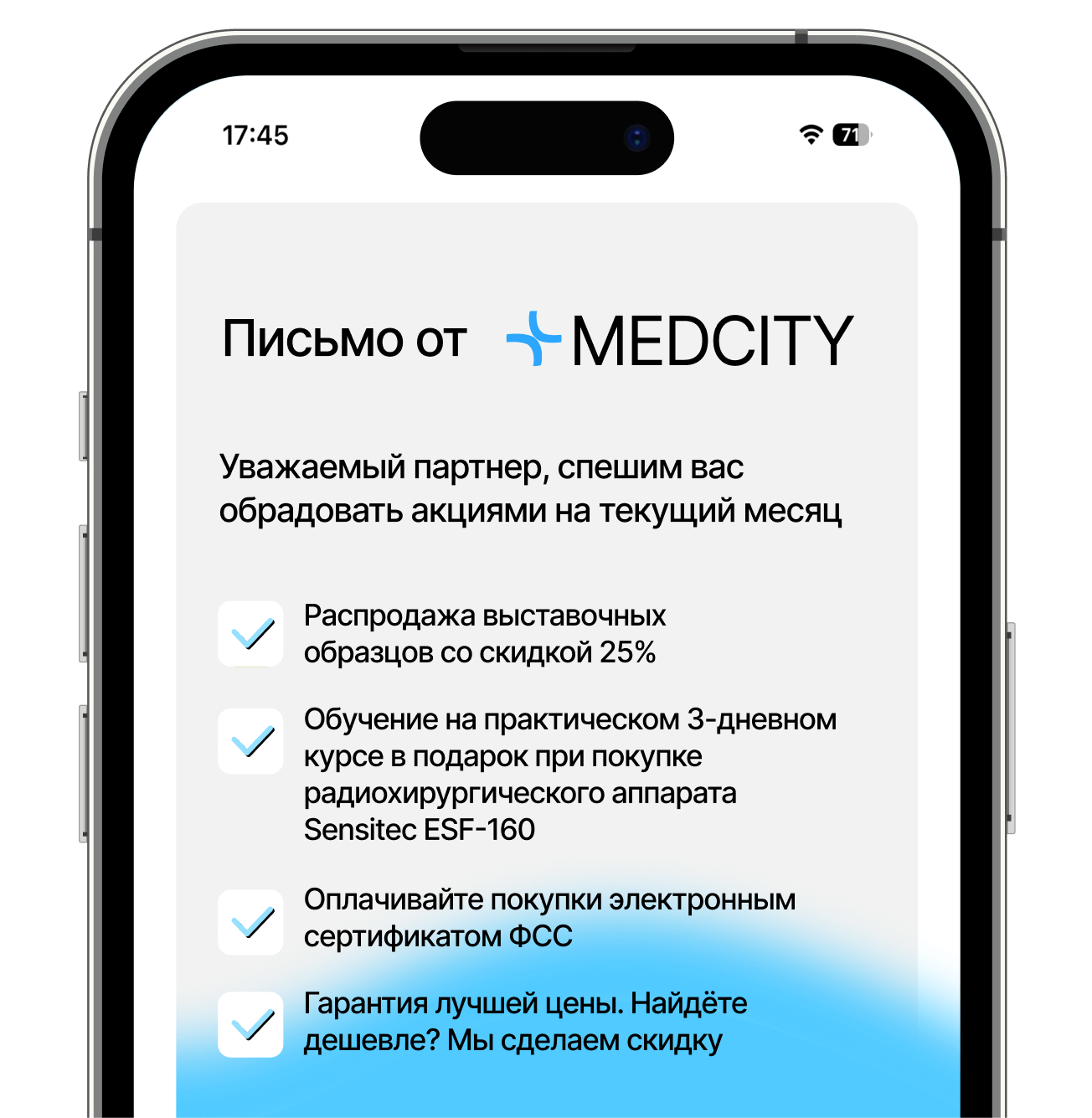 Мы стремимся сделать медицинское оборудование доступным для всех клиник, независимо от их размера и бюджета. Вы можете оформить рассрочку Долями без переплат, взять оборудование в лизинг или воспользоваться Trade-in.